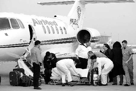 在新郑国际机场的停机坪内,记者看到一架红白相间的小型喷气式飞机,机身上红色十字的救护标志十分醒目,飞机降落后,飞机内的外籍机务人员和护士用专用的医用担架,将正在熟睡中的郑丽抬下飞机,送上机场的120急救车,然后送往郑州市内一家医院,整个过程用了半个小时。