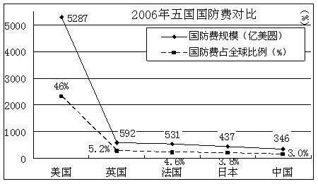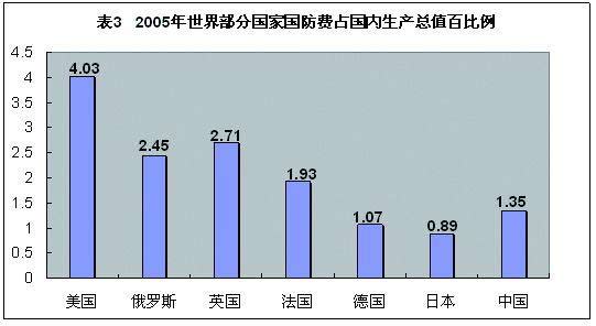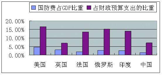 从绝对指标来看,以2004年为例,美国的国防费占全球国防费总开支的47%,日本占4.1%,而我国仅占2.4%。从相对指标看,美国国防开支占GDP的3.9%,我国是1.38%,其为我国的2.5倍。在国民人均国防费开支、每平方公里平均国防费等方面,我国在世界上均处于很低的水平。
