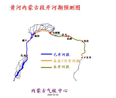 根据未来5天黄河内蒙古段沿线天气预报,3月20日—21日气温略有回升, 3月22日 —23日,将有一次大风、沙尘及降温天气过程,气温下降6~8℃。受气温变化的影响,未来5天巴彦淖尔市临河至乌拉特前旗段将逐步开河。