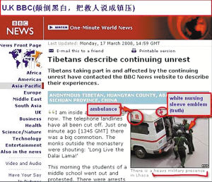 公安武警解救被袭汉族民众,却被说成是在抓捕藏人;尼泊尔警察抓捕藏人抗议者,却被说成是“发生在西藏的新事件”;明明是写着“急救”字样的救护车,却被描述成“在拉萨有很多军队”……