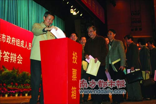 2月26日,南京举行全市干部大会,与会者包括南京市四套班子领导成员、出席过党的十七大和江苏省十一次党代会的代表等,共300多人。会上,人手一张选票,选票上有51个“填空题”:填写51个部门区县一把手的推荐人选,其中包括南京市政府47名组成人员人选和4位区(县)委书记人选。