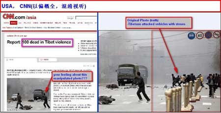 声明中写道:“一个叫‘’的网站和其他一些地方对于CNN在西藏事件上的报道点名批评。”对于中国网民对CNN将一张图片中“藏独”分子向卡车投掷石块的画面进行剪裁的不满,CNN辩称,“受到质疑的那幅照片被完全‘适当地’应用在了特定的编辑内容中”,并称所展示的内容不会引起误解。