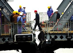 为保证外白渡桥移桥过程中桥梁结构安全,移桥工作将分南、北两跨分次进行。今天上午先移除南跨桥体,明后天移除北跨桥体。昨天下午,负责“移桥”的千吨驳船已进入金山路闸桥,停靠外白渡桥上游。今天上午9时10分,两艘拖船将驳船拖至外白渡桥南跨桥体正下方,截至上午10时,驳船已开始顶升桥体。