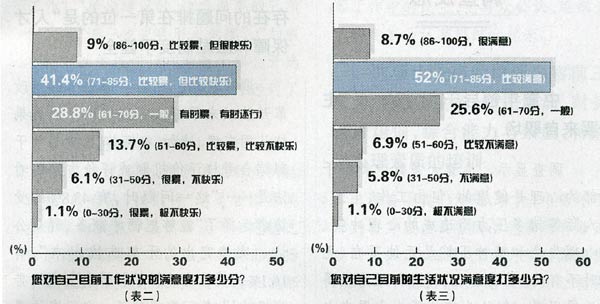 调查显示,尽管大多数中青年干部的心理是健康的,但由工作、生活、人际等诸多压力而造成的心理冲突、心理失衡和精神压抑是无处不在、无时不有的。受访者在回答“如果您觉得活得很累,您认为您的压力主要来自哪些方面?”这一问题时,选择最多的前三项分别是“工作责任心太强,追求完美之累”,“工作负荷重,疲于奔命之累”,“迎合领导出政绩,失去自我之累”,选择比例分别达到了51.3%,34.7%和29.2%,而选择“交际太繁,苦于应酬之累”,“前程靠人恩赐,职场非正常竞争之累”的各占20.3%,并列排在第四位,最后依次是“家庭负担重,子女入学就业之累”,占12.9%,“与同事、朋友比心理不平衡之累”,占5.9%,以及“多种压力”等,占2.6%。