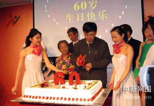 陈毅之子、中国对外友好协会会长陈昊苏(中)重回母校,为“红色幼儿园”切六十华诞生日蛋糕。