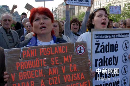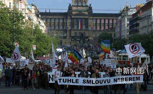 捷克首都布拉格5月5日再次爆发反对美国在捷克设立反导雷达基地的游行示威。大约1500名示威者展示“这个协定我们不接受”等标语从瓦茨拉夫广场出发穿越市中心,举行反对美国在捷克设立反导雷达基地的游行。(黄频 摄)