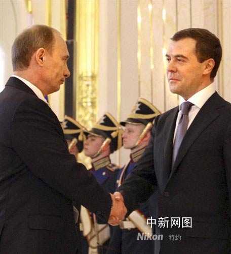 5月7日,俄罗斯当选总统梅德韦杰夫(右)宣誓就职。