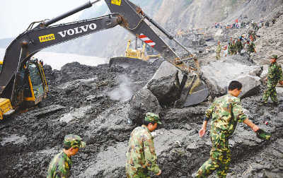 冒着余震与滚石,川高公司董事长高淳带队连续作业72小时,终于在14日早上7点,啃下第一块硬骨头——K950处,目送第一台挖掘机驶过。