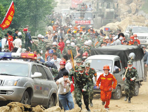 5月17日下午3时40分,记者再次来到北川,刚刚走到救援部队的大本营——任家坪时,就发现大量的灾民和救援人员往外涌,行进的车辆和脚步匆匆的人群使路面扬起了阵阵灰尘。重庆消防支队一位战士告诉我们,因为北川后侧山顶的水坝可能决堤,1个小时前已经发出信号弹,要求救援人员和灾民撤离北川县城。