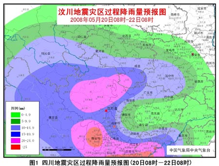 20-21日,震中及其附近地区将有一次中雨过程,四川汶川、北川、理县、茂县、绵竹等重灾区的降雨量有8-22毫米,四川松潘、黑水、马尔康以及甘肃文县降雨量可达25-40毫米(图1),并伴有短时雷电、雷雨大风等强对流天气。22日,震区还将有2-8毫米的降雨(图2)。需注意局地强降雨给抗震救灾工作带来的不利影响。