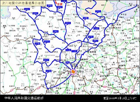 戴东昌介绍,到目前为止,通往重灾区的三条生命线,作为公路运输的主通道已经打通。第一条抢通的是通往汶川的大通道,它是在5月15号晚上9点半打通。之后,相继在5月17号打通了从甘肃往南到茂县的北线,以及从成都经过都江堰到映秀的南线。应该说南线这条线最艰难,灾情最严重,在抢通过程中遇到困难也是最大的。这三条生命线在维护人员的全力维护下能够保持畅通。