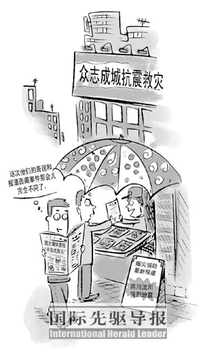 国际先驱导报文章 中国发生“5·12”汶川大地震之后,西方媒体给予了大量积极正面的报道。一直以来认为“中国媒体不可信”的西方媒体,比如CNN、BBC等,在此次地震报道中都大量使用了中国媒体的电视画面和文字报道,这十分少见。与之前报道西藏“3·14事件”、“奥运圣火传递”相比,西方媒体报道的态度来了个180度的大转弯。即使有少量负面报道和批评声音,但这些已经让西方读者觉得不那么可信了。西方民众、媒体评论人,总体上都正面评价中国政府组织的抗震救灾,以及赞扬中国人民在灾难面前表现出来的勇气。