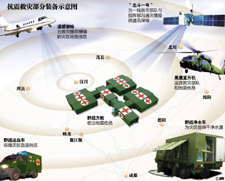 “北斗一号”、航测飞机、野战医疗方舱、野战运血车……这些带有硝烟味道的军事名词,在连日来的四川抗震救灾中大显身手,发挥了不可替代的作用。