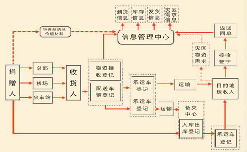 非常时期,物资调配十万火急。在不延误救援的前提下,中国红十字会打破常规,震灾初期根据灾区所需随收随出,但仍然尽可能严格规程。在洪俊岭的办公桌上,一张“四川省红十字会救灾物资信息管理流程”清晰地标出从捐赠、收货、物资配送和承运、备灾中心入库和出库、目的地接收、返回回单等重要环节。