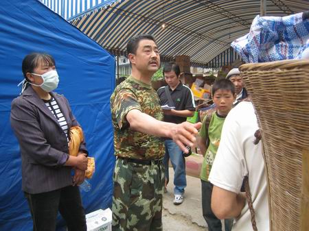昨日,14岁的龙和平背着背篓,步行两个多小时,从擂鼓镇河道村来到北川中学,准备背些吃食回去。王洪发急了:“你从擂鼓走十七八里到这里来干啥?没车,你背不背得回去嘛?”王洪发不停地“批评”那个孩子:“擂鼓也可以领东西。”与龙和平同来的河道村村民有10来个。站在物资分配警戒线外,王洪发不停地为大家解释,民政局正在登记造册。