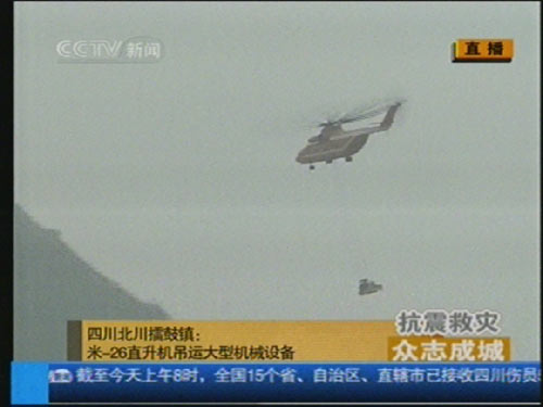 中新网绵阳5月26日电(霍潺)今天上午十一点零五分左右,一架红色米-26直升机吊装了一台重约十三点二吨的重型挖掘机已起飞,前往唐家山堰塞湖坝体,大约二十多分钟可以往返。