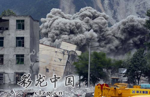 映秀镇的危险房屋被爆破拆除。记者 韩亿国摄 (来源:彩龙中国)