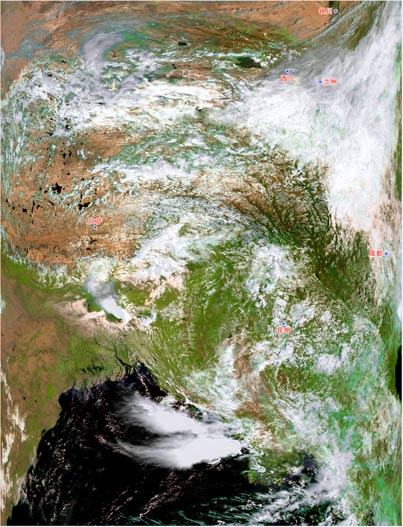 从北京、广州、乌鲁木齐、佳木斯4个气象卫星地面站接收到风云三号A星第一轨可见光图像中可以明显看到,云图右侧的西北地区东部、西南地区东部以及青藏高原东北部受过境锋面系统影响,被白亮的云系覆盖;云系南侧,包括四川地震灾区在内的盆地地区为层状云覆盖;云图左侧青藏高原其他地区上空云量较少,地表清楚,青海湖、哈拉湖、纳木错、色林错等水体清晰可辨。