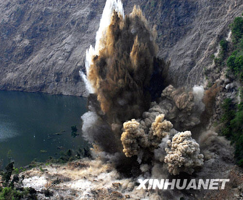汶川地震发生后,青川县青竹江石板沟一带形成蓄水1200多万立方米水的堰塞湖,威胁着下游数万人安危,其中蓄水超过800万立方米的石板沟堰塞湖被水利专家定为高危湖。随着雨季来临,高70多米的堤坝随时都可能出现险情。为防止意外发生,武警水电三总队对石板沟堰塞湖大坝实施了泄洪口爆破。