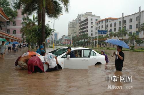 受高空槽和切变线共同影响,六月五日至六日,广东茂名各地出现明显强降水过程,全市日降雨量均值八十五毫米。由于降雨量大且强,致使茂名市局部地区出现洪涝和山体滑坡灾害,并导致高州古丁镇一名九岁男学生及一名十四岁女学生失踪。据统计,这次暴雨成灾,茂名全市有六个县区八十一个镇约六十万人受灾,倒塌房屋近千间,直接经济总损失二亿元人民币。图为茂名市区几成泽国。 中新社发 梁盛 摄