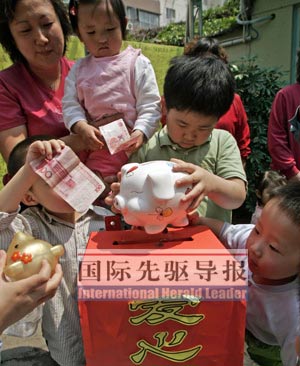 5月15日,天津和平区保育院的儿童带着自己的存钱罐,向四川地震灾区捐献自己的“积蓄”。刘海峰/摄