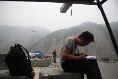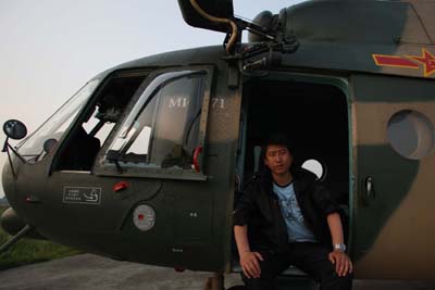 中新社摄影记者盛佳鹏等候直升飞机飞往灾区