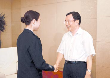 图为贺国强与“抗震救灾优秀纪检监察干部”蒋敏亲切握手。(李玉龙 摄)