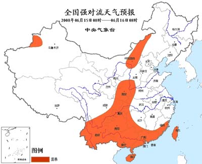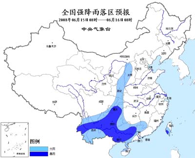 中新网6月15日电 中央气象台今晨六点钟发布暴雨预报: