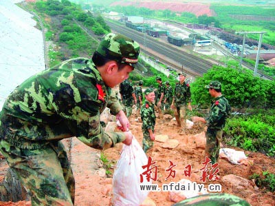 前日18时,京广铁路清远龙塘段发生6处山体滑坡,直接威胁京广交通大动脉的安全,广东省清远军分区立即组织清城区民兵应急分队400多人连夜赶往抢险。