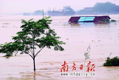 记者在莺哥咀水文站附近看到,内河堤内的香蕉树及其他一些防洪树木,此刻全部被淹没在洪水中,只露出树梢在外面摇摆。在离水文站不远处,一管桩厂也全部被洪水淹没。一村民告诉记者,该厂的所有员工已于日前全部撤至安全地带。