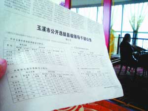 2007年1月,玉溪市要公开选拔4名县处级干部的消息公布。这四个职位分别是玉溪市统战部副部长、团市委副书记、市旅游局副局长和市信息产业办副主任。