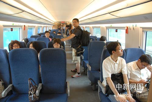 京津城际列车于北京新南站始发,列车呈全封闭状态,里面的空间舒适而洁净,广播里播放着背景音乐,空调十分凉爽宜人,蓝色软席座椅前后排距离约有五十公分,扶手上有调节座椅高度的按钮,座椅背后有小桌板和网兜。