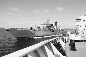 海军某支队与兄弟单位保障舰船密切协同,进行海上紧急补给训练。钱晓虎摄