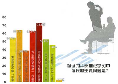 “就你的感觉,干部对理论学习的总体态度如何?”问卷调查结果显示,72.6%的受调查者表示“只是政治任务,应付而已,谈不上兴趣”或“形式主义严重,可有可无”。“你认为干部理论学习中存在的主要问题是什么?”排在第一位的是“存在形式主义现象”占受调查者的72.9%。