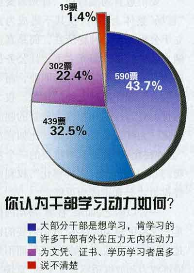 本次调查结果显示,干部在工作中的感受,58.3%的受调查者认为尚能应对,能力与新任务与时俱进,31.5%的受调查者表示紧张,压力大,有精力透支现象。而在“本单位的干部选拔任用、职务/职称晋升中,下列哪些因素的作用影响最大?”的问卷调查结果显示出,排在前三位的是:工作能力(占总73.5%)、群众关系(占总68.2%)、领导关系(占总63.4%)。相当部分的干部认为能力已能应付工作,这也就部分地解释了干部学习动力不足的原因。