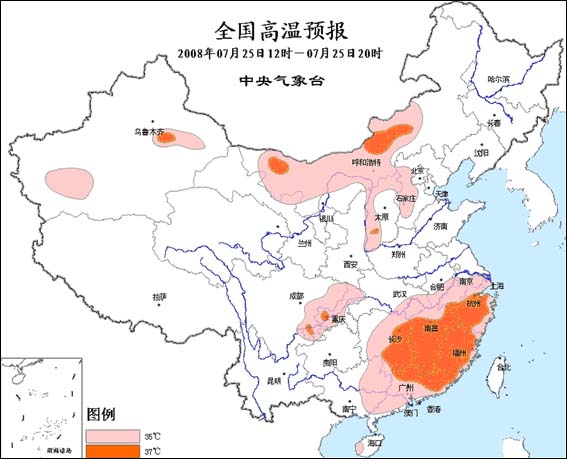 中新网7月25日电 中央气象台2008年7月25日10时发布高温预报:预计今天白天,江淮南部、江南大部、华南中东部、四川盆地东部、重庆大部以及新疆吐鲁番盆地、内蒙古中西部、山西西部和北部、河北西部等地将有35℃以上的高温天气.