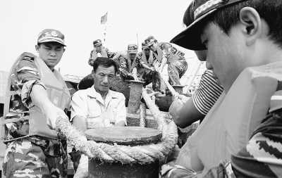 图为7月26日,浙江台州礁山港,边防官兵帮助渔民加固缆绳,以防范台风“凤凰”。郏 策摄