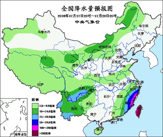 27日20时至28日20时,新疆西部和天山附近地区、青藏高原大部、甘肃中部、宁夏北部、陕西南部、内蒙古大部、黑龙江西部、华北西北部、黄淮中南部、江汉西部、西南地区大部以及江南中东部、广东东部、海南、台湾等地有小到中雨或雷阵雨,其中,四川东南部、云南西部和南部的部分地区有大雨;福建中东部、浙江中南部、广东东部等地有大雨或暴雨,福建东北部、浙江东南部的部分地区有大暴雨;台湾大部将有暴雨或大暴雨,局地有特大暴雨,上述部分地区并将伴有短时雷雨大风或冰雹等强对流天气。内蒙古中东部、东北大部有4~5级偏北或偏南风。东海南部海面、台湾以东洋面、台湾海峡、巴士海峡、巴林塘海峡、南海东北部、台湾、福建沿海、浙江南部沿海将有8-11级大风,“凤凰”中心经过的附近海面风力可达12-14级。