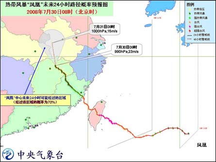 中新网7月30日电 据问天网消息,中央气象台2008年7月30日10时发布台风消息:今年第8号热带风暴“凤凰”(FUNG-WONG)的中心今天上午10时位于江西省波阳县境内,即北纬29.1度,东经116.5度,外围最大风力有8级(20米/秒)。