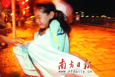 海陵岛上的小游客在狂风中艰难行走。本报记者朱丹阳梁文祥摄