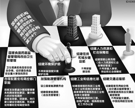 由此,一场中央政府机构改革大部制的大布局,逐渐清晰地展现在人们面前。而其中的中心环节,即“三定规定”,则史无前例地发挥了刚性作用。2008年3月份全国“两会”确定大部制改革,6月25日,国务院常务会议上审议通过《主要职责、内设机构和人员编制规定》,即所谓“三定规定”。