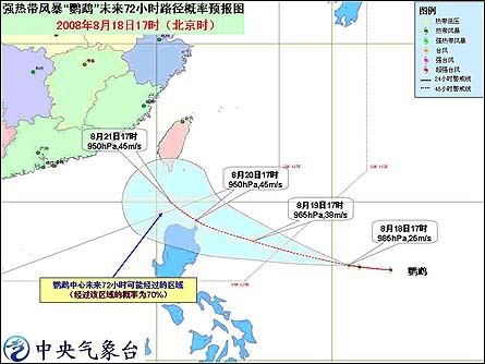 预计强风暴中心将以每小时20-25公里的速度向西偏北方向移动,强度继续加强,逐渐向台湾东南部海面靠近。受其影响,19日白天,巴士海峡、巴林塘海峡、台湾以东洋面的风力将逐渐加大到6-8级。