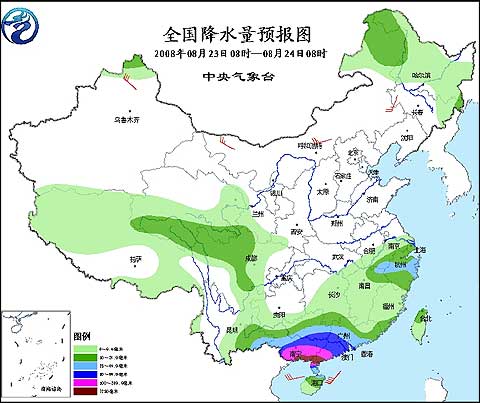 2008年8月23日08时—8月24日08时全国降水量预报图