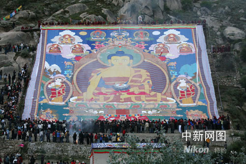 雪顿节最早是一种宗教活动,是老百姓以酸奶对寺院行长净、夏安居之事后解禁僧人的敬奉。十七世纪下半叶,雪顿节逐渐演变和固定成以藏戏汇演和展佛为主、文娱与宗教相结合的重要节日,所以又被称为“藏戏节”、“展佛节”。自去年起。该节升格为“中国拉萨雪顿节”,成为国家级旅游、文化、经贸节庆。今晨有上万游客及信众在现场参观了哲蚌寺展佛。