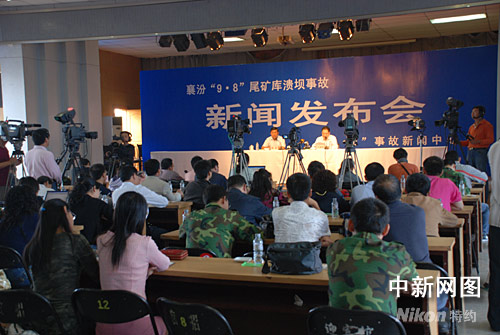 9月11日上午11时许,山西襄汾“9.8”尾矿库溃坝事故举行第一次新闻发布会,发布会在襄汾县一家宾馆内举行。山西省委宣传部副部长杨波主持会议,山西省政府秘书长王清宪发布事故有关情况。记者:张雷杰 摄