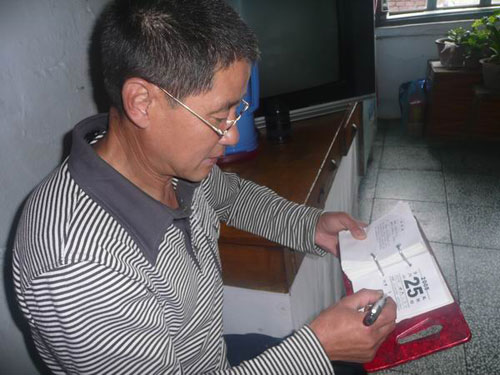 翟志强戴着花镜计算着弟弟升入太空的时间。