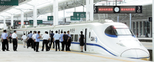 左图 京津城际高铁将于24日开行4对动车组列车从北京南直接驶入天津滨海新区——塘沽火车站。昨日,塘沽火车站开始售票,动车组已进入该站调试。(记者 廖晨霞 傅桂钢 摄)