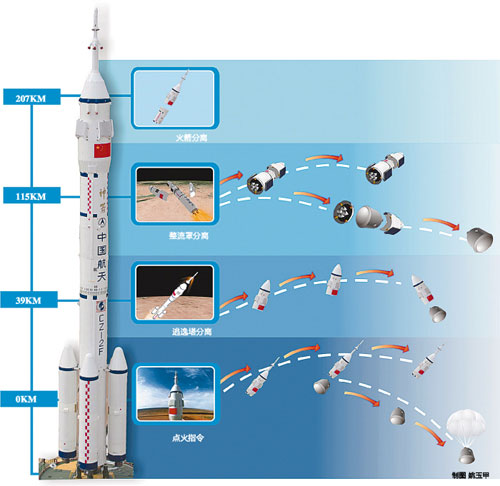 从火箭发射前30分钟到起飞后120秒、飞行高度在39千米时逃逸塔分离,以及从120秒到200秒左右、飞行高度115千米时整流罩分离这两个时间空间段内,万一发生意外紧急状况时,逃逸塔就会启动,靠固体燃料火箭发动机提供巨大的瞬间推力,将航天员所在的飞船从火箭上拉出来,带着航天员偏离火箭的运行轨道,逃离险境,然后借助降落伞和缓冲装置安全降落到地面。由于增加了逃逸系统,长征二号F火箭的安全性指标由过去发射100次可能出现3次危及航天员生命的问题,减少到现在发射1000次才可能发生3次这样的事故,达到了国际先进水平。