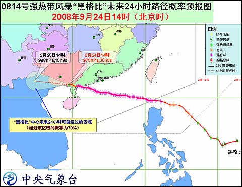 中新网9月24日电 据中国天气网消息,今年第14号台风“黑格比”24日14时在广西沿海减弱为强热带风暴,位于广西合北海市合浦县境内,即北纬21.7度,东经109.5度,台风中心附近最大风力11级(30m/s),强度将继续减弱。