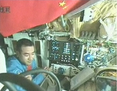 据报道,在神七传回的舱内画面显示,轨道舱内航天员正在组装航天服,舱内有一面红色的旗帜,经确认过这是一面五星红旗。